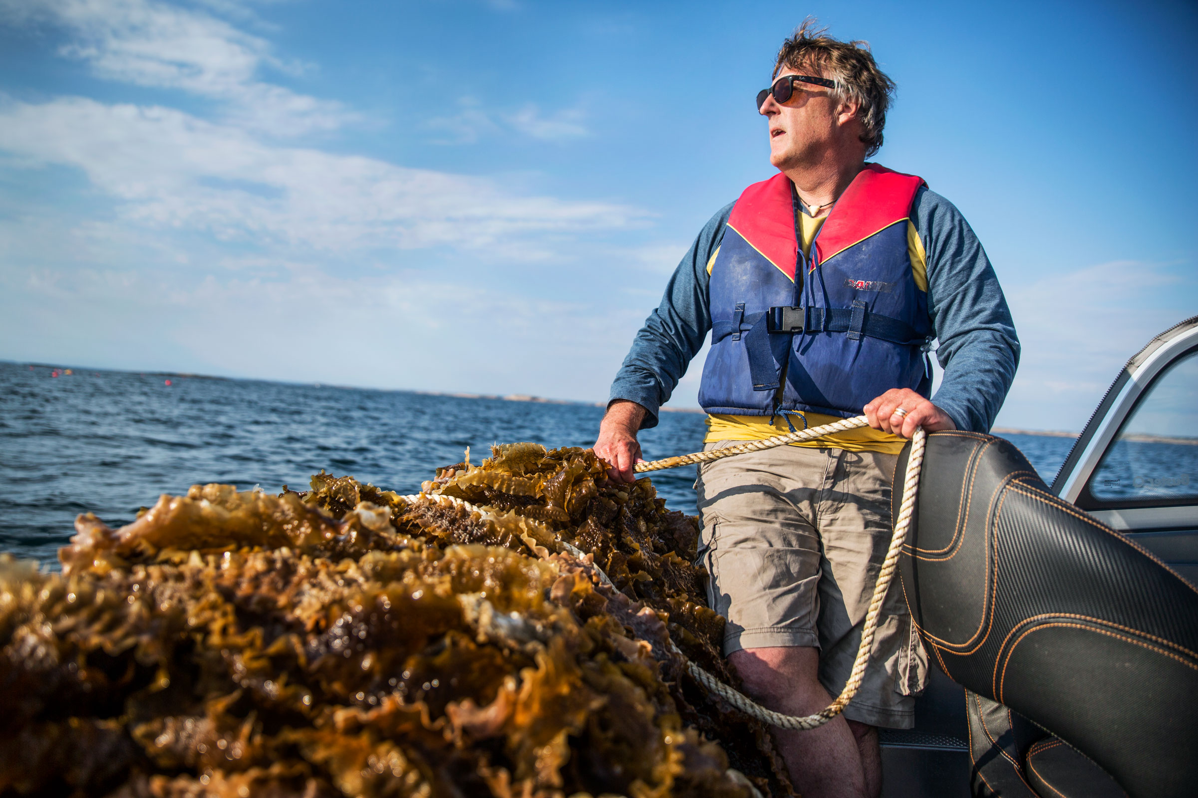 Fredrik Gröndahl drar mödosamt upp en stor klase i båten, de tunna gulgröna algerna ser närmast självlysande ut i det mjuka eftermiddagsljuset. När vi ser bonden och havet där i motljuset undrar vi om det är så här framtidens matförsörjare kommer att se ut.