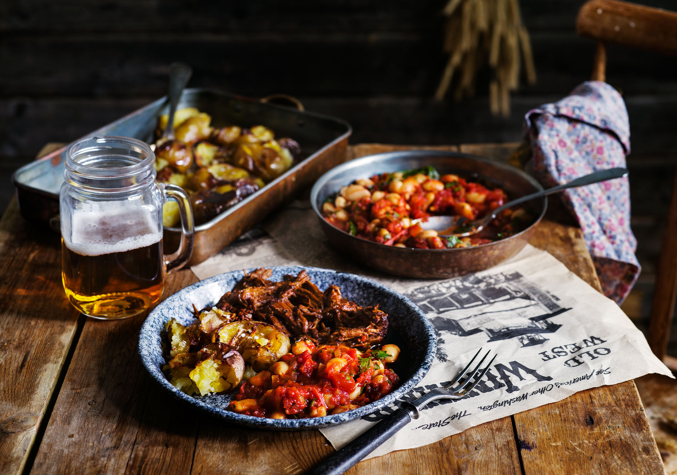 Vi har tolkat maten i berättelsen som en ”präriemiddag” med hemgjorda vita bönor i tomatsås och en variant på pulled pork i stället för corned beef. Det är inte nödvändigt, men du kan servera ugnsstekt potatis till.