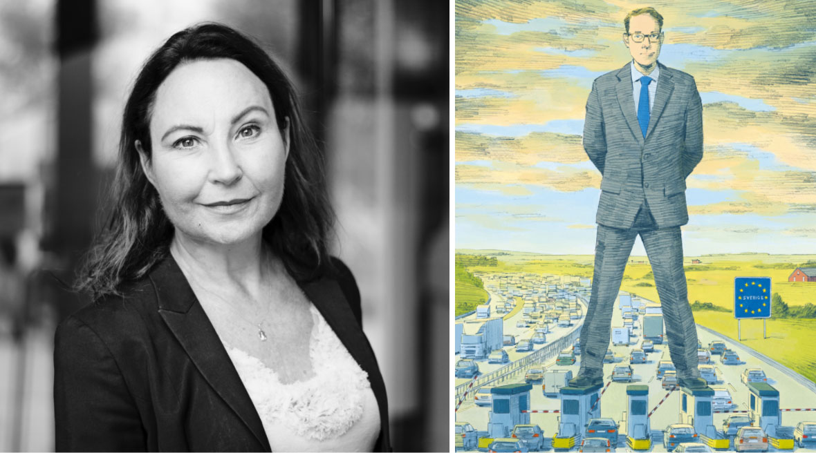 – Graham Samuels är en helt fantastisk tecknare. Självklart har en migrationsminister mycket makt, så en jätte som står vid en gräns var en fin illustration för den tillbakablickande artikel som jag skrev 2014. Då gestaltade teckningen reglerad invandring med en förhållandevis öppen gräns – titta på Billströms fötter i teckningen. Men tillsammans med texten i tweeten i helgen ger det som sagt intryck av att vara tvärtom. Det är helt klart så som Tobias Billström vill framställa sig idag.
