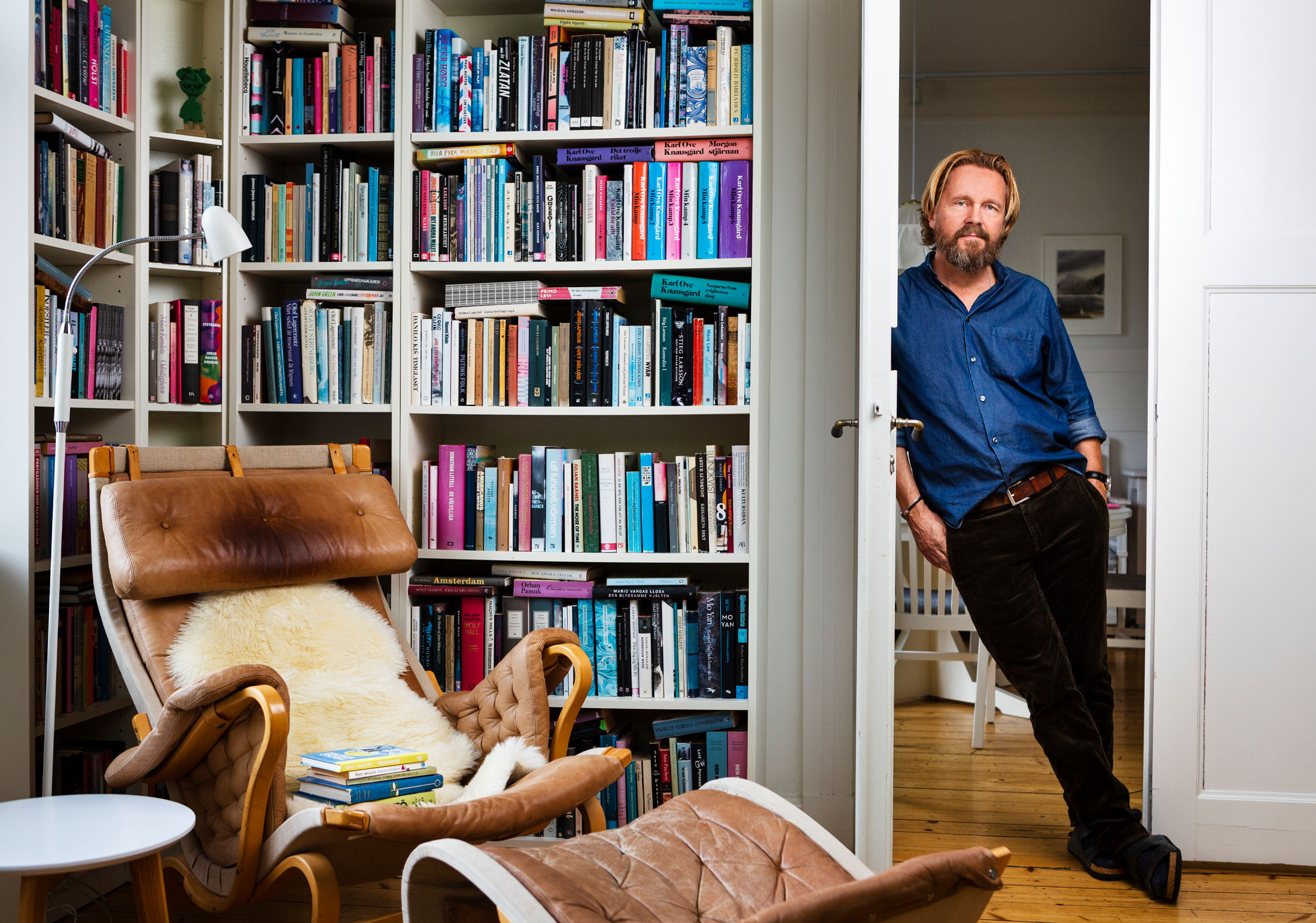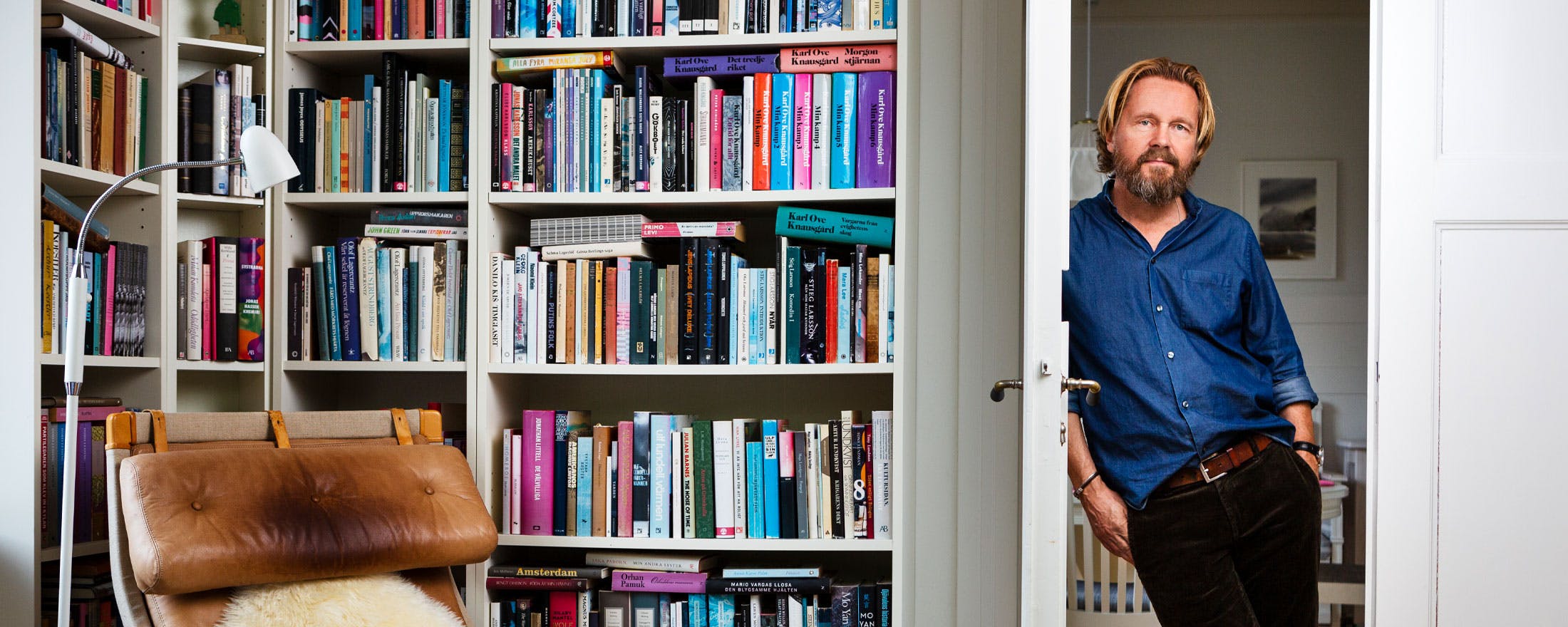 Gissningen stämmer. Vi kan börja med den svenska skönlitteraturen i vardagsrummet, uppifrån Lars Ahlin till Klas Östergren längst nere vid golvet. Mest synd är det ändå om Jonas Gardell och Sigmund Freud vars böcker döljs bakom en soffrygg.