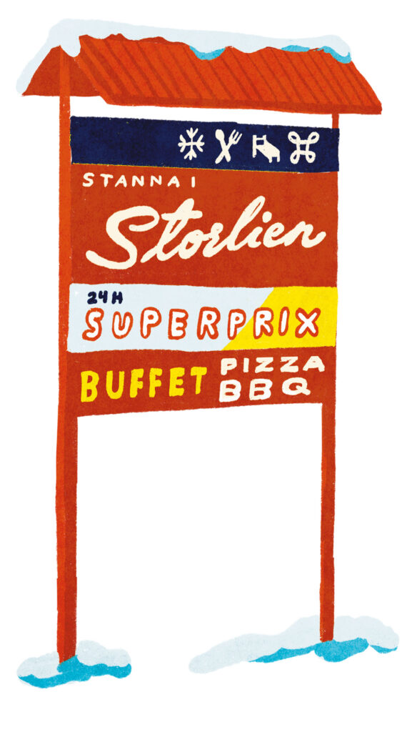 På det gamla stationshuset i sten, en bedagad skönhet, sitter alltjämt den klassiska inskriptionen ”Storlien. 600 meter över havet”. Mitt emot järnvägshotellet ligger en thaikiosk och norra Europas största godisaffär, Super-Candy. En av bygdens gammpojkar med orange toppluva och snus i mungiporna knatar förbi på spark. På andra sidan järnvägen, invid E14, ligger den enorma handelsplatsen, ”Jämtlands Ullared”. Hit går de norska ”fleskbussene” i skytteltrafik med prismedvetna norrmän som länsar kyldiskarna på billig köttfärs. Alla skyltar är på norska.