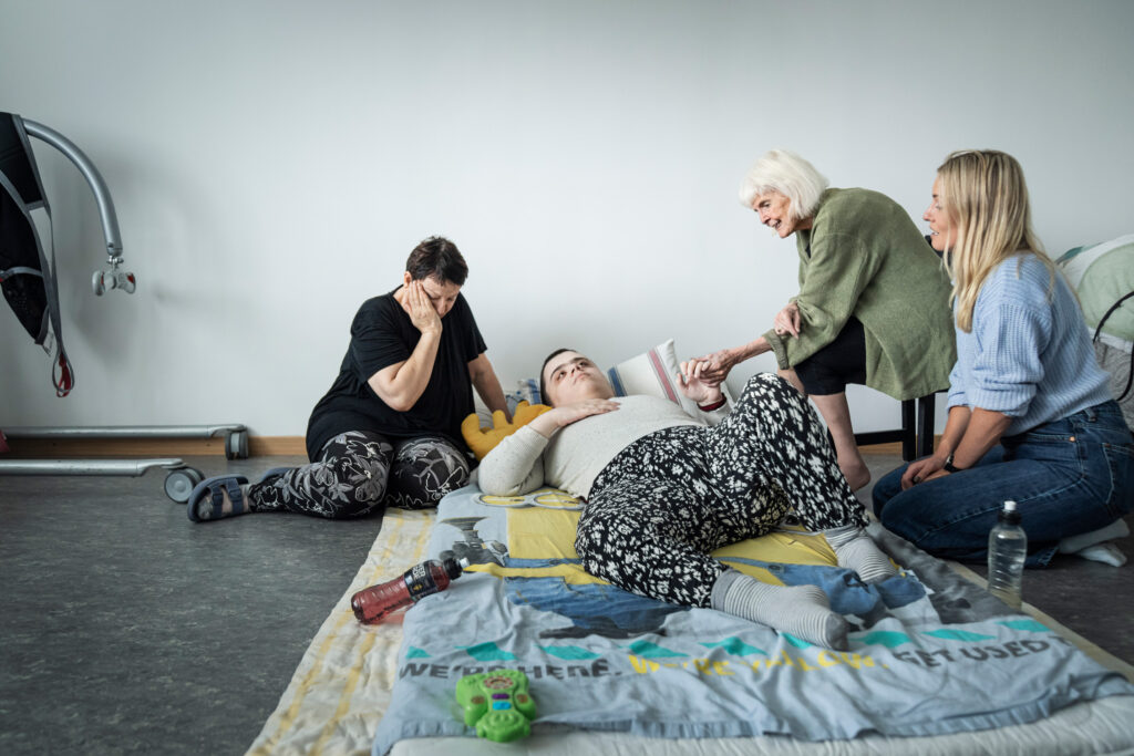 Anita D’Orazio, som är på besök från Stockholm, har stått för den hjälpen. Hon sitter vid Edions madrass och har intensiv ögonkontakt med honom, nästan panna mot panna.