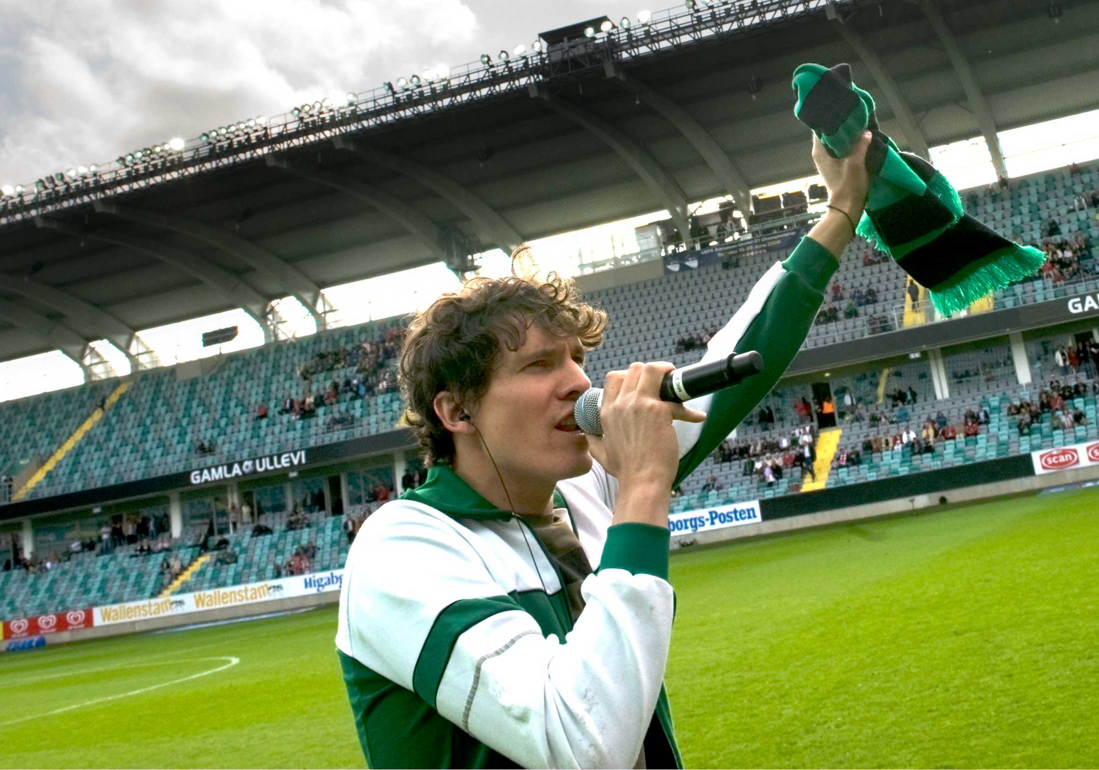 Håkan Hellström värmer up publiken inför en match mellan GAIS och Kalmar FF på Gamla Ullevi i Göteborg, 2009. // Foto: Björn Larsson Rosvall/TT