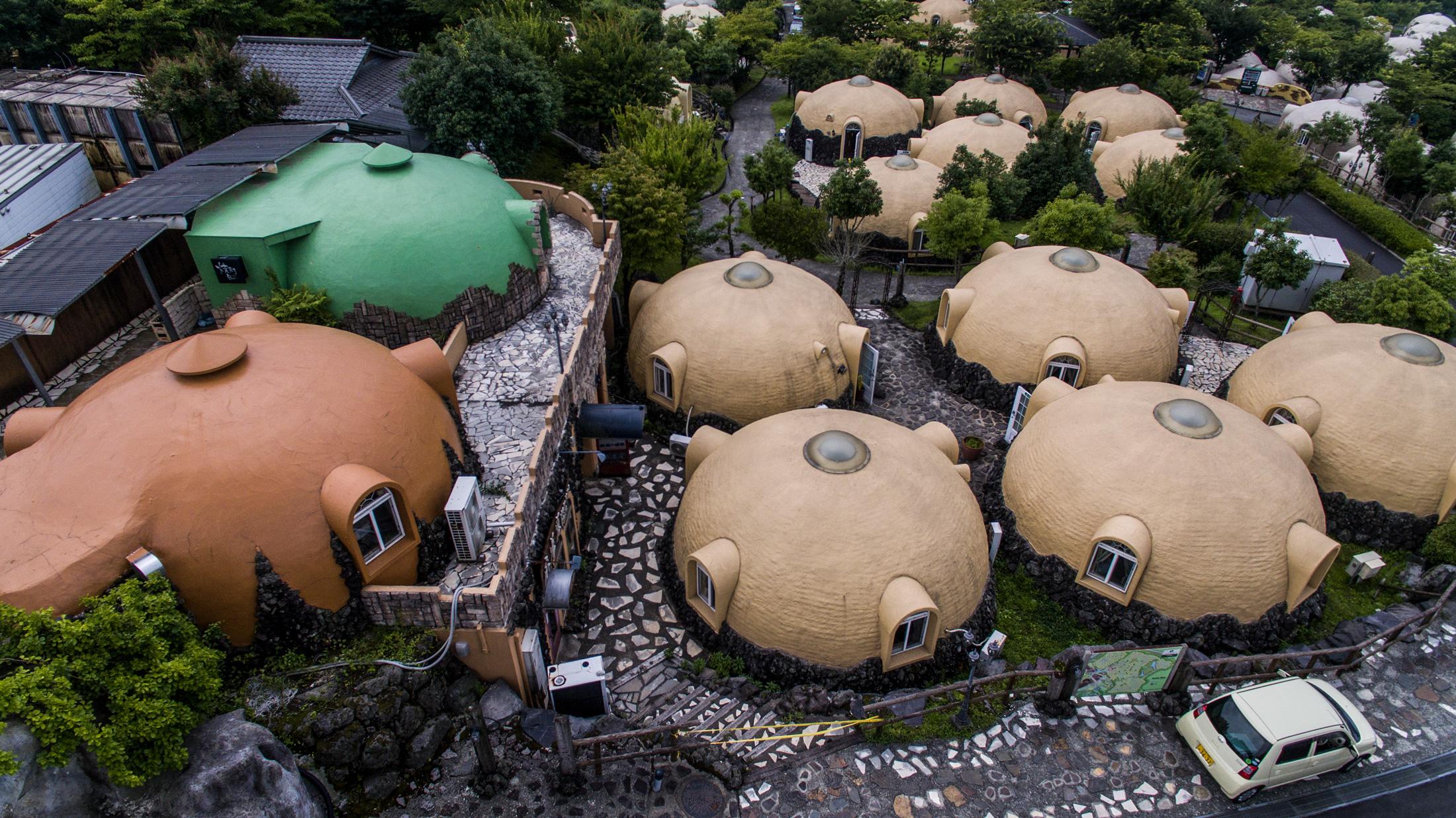 Varje år drabbas Japan av cirka 1 500 jordbävningar, allt från mindre skalv till katastrofer – som den som inträffade 2011 vid landets östkust då kärnkraftverket i Fukushima skadades allvarligt. Provinsen Kumamoto, i södra Japan, skakades av ett förödande skalv 2016 och intresset för dessa rundade lättviktshus mångdubblades, då inget av dem skadades under skalvet. I dag lockar de 450 husen turister från hela Asien.