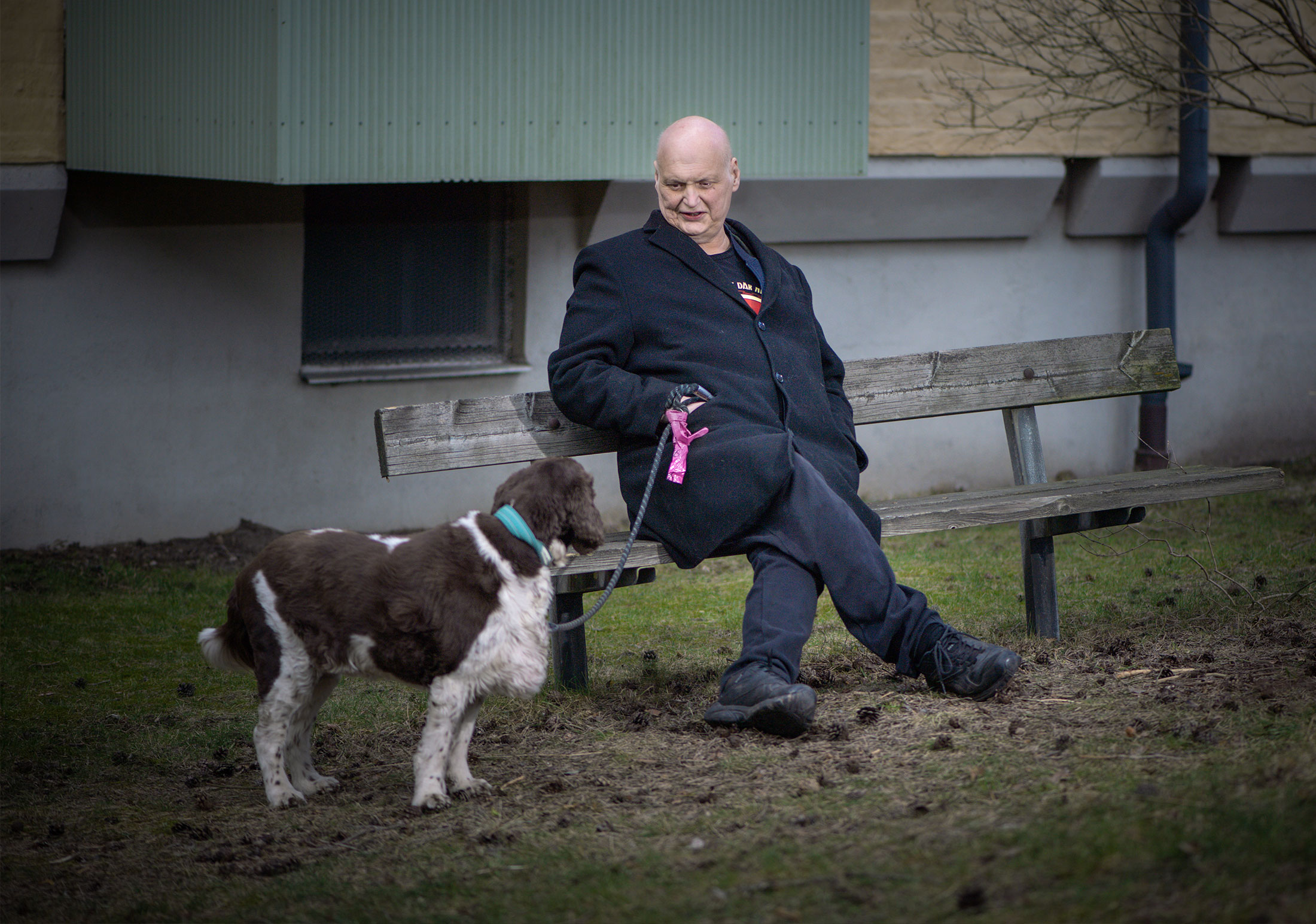 Göran Greider med hunden Stina. // Foto: Magnus Hallgren