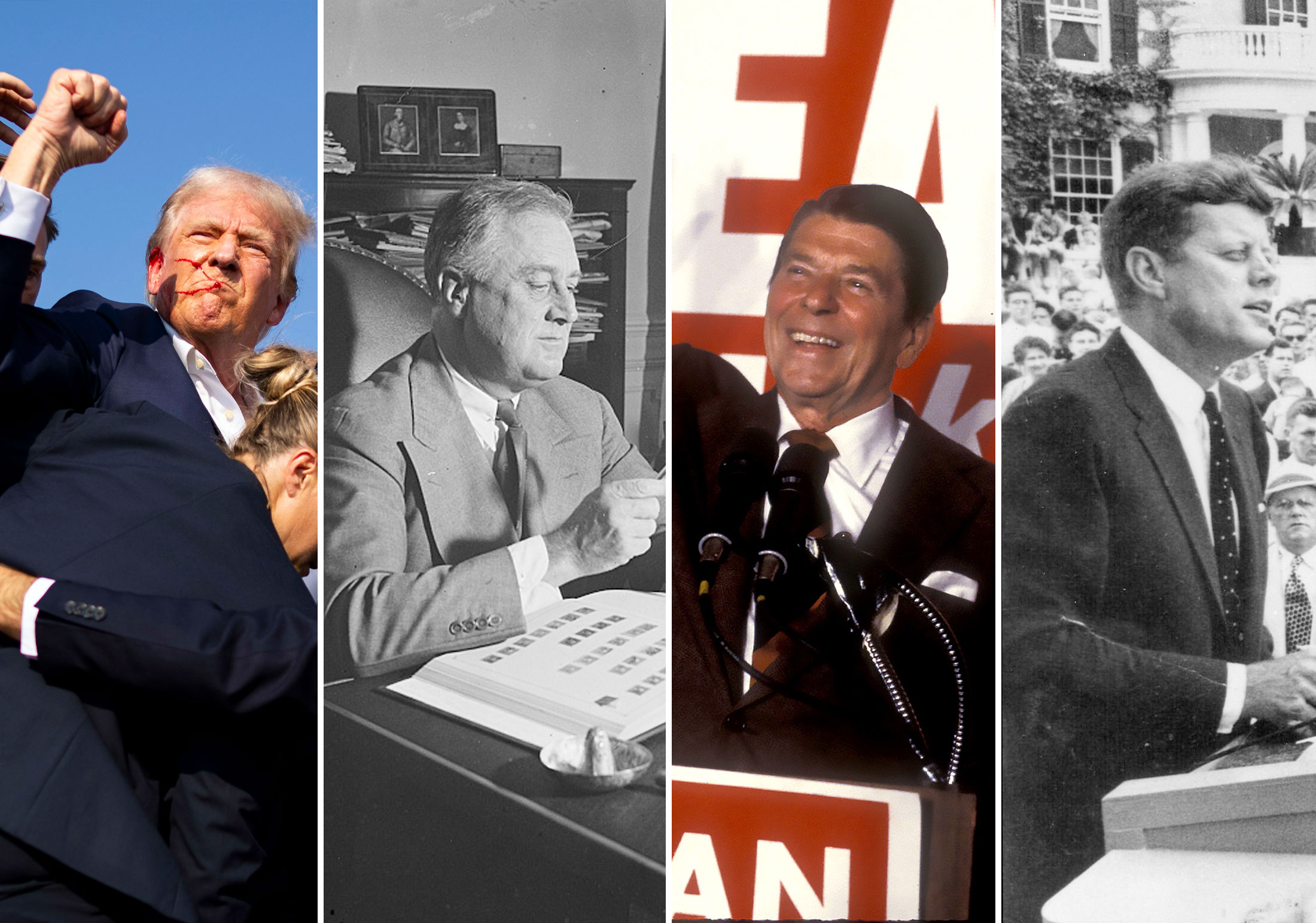 Montage. Från vänster till höger: Donald Trump, 2024, Franklin D. Roosevelt, 1936, Ronald Reagan, 1980, John F. Kennedy, 1960. // Foto: Doug Mills/The New York Times/TT, Harris & Ewing, Rick Friedman/TT, FDR Presidential Library & Museum.