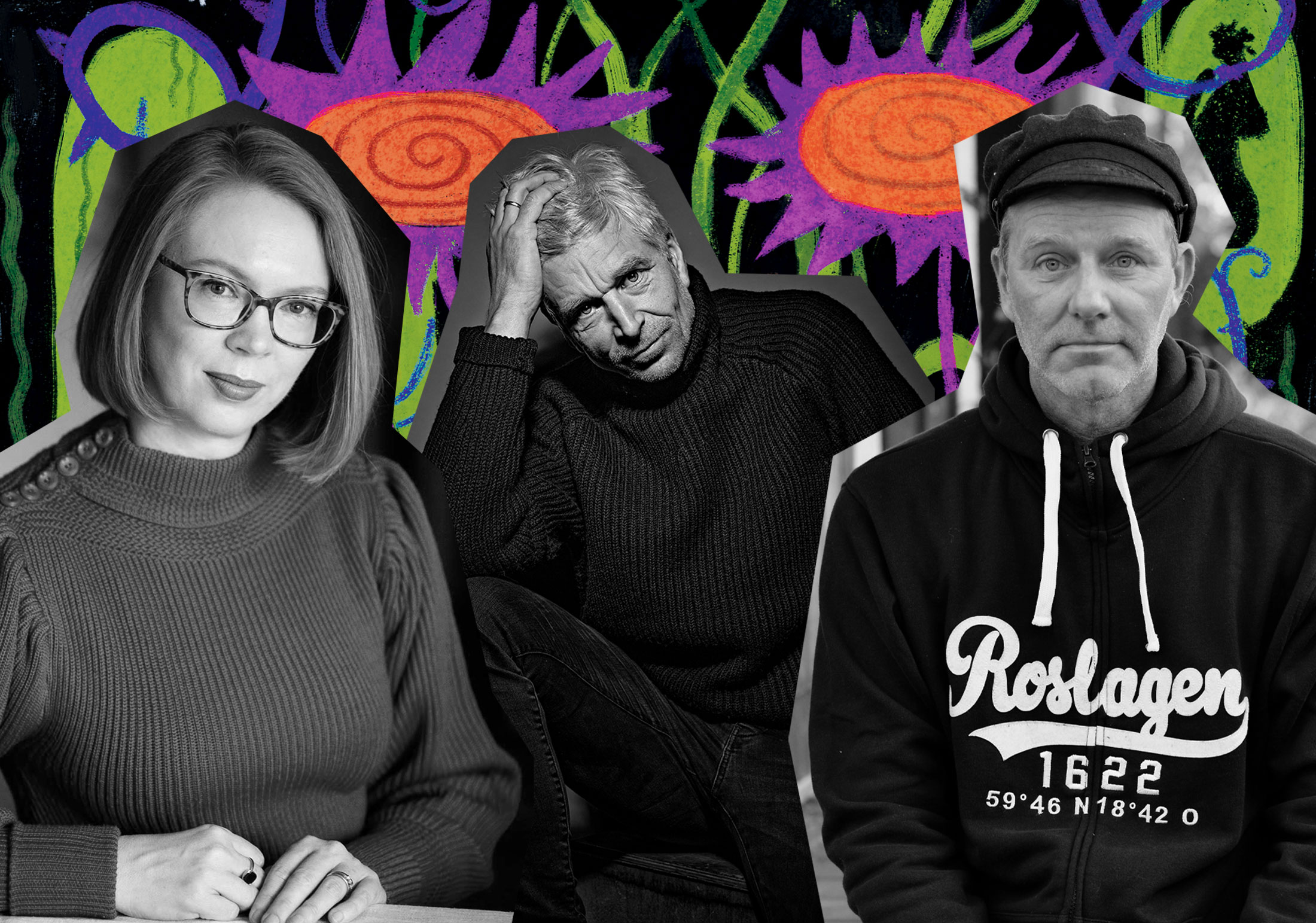 Maria Turtschaninoff, Karl Ove Knausgård och John Ajvide Lindqvist. // Kollage. Foto: Veikko Somerpuro/Nina Rangøy/ Mia Ajvide. Illustration: Sanna Mander