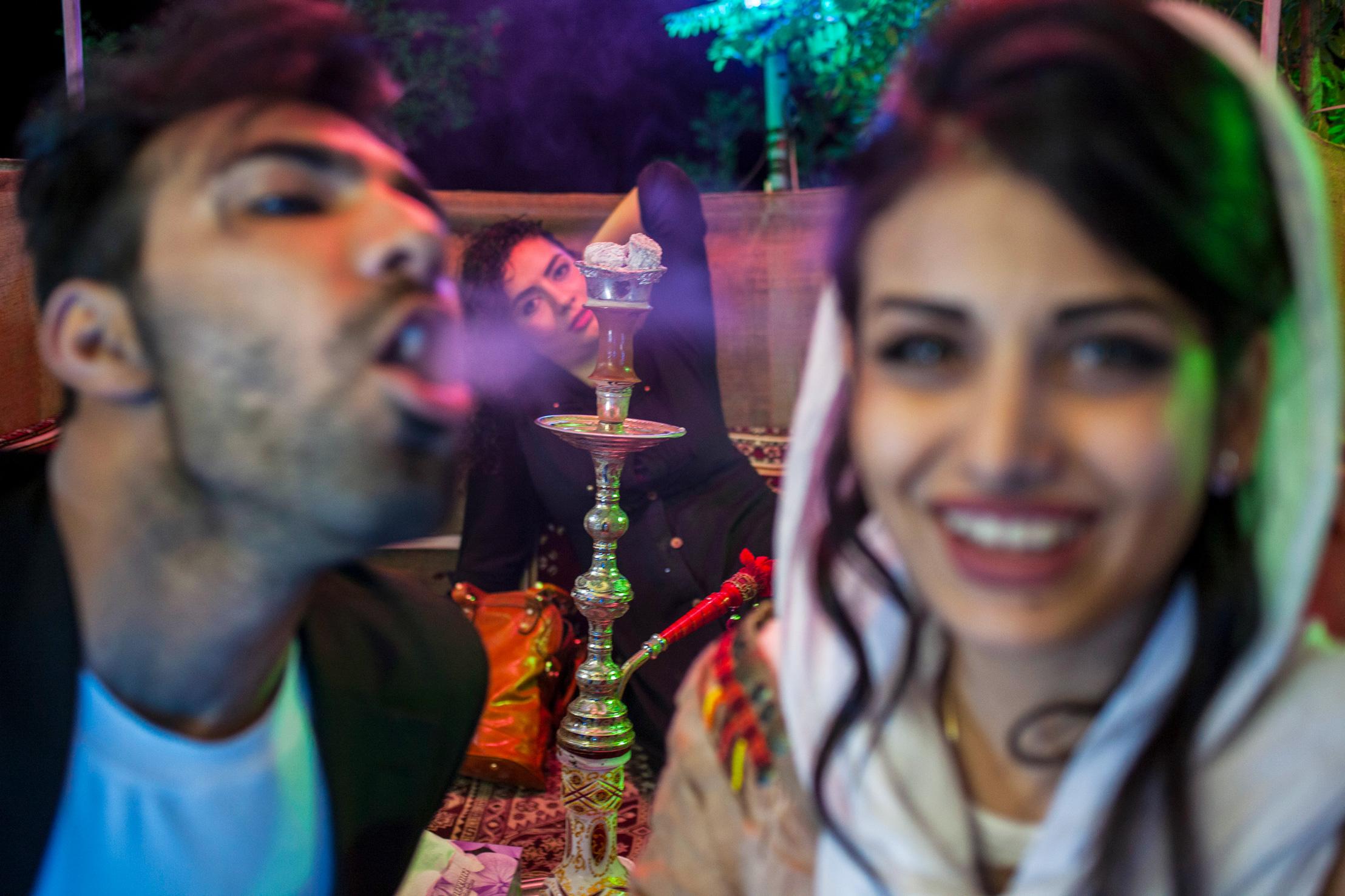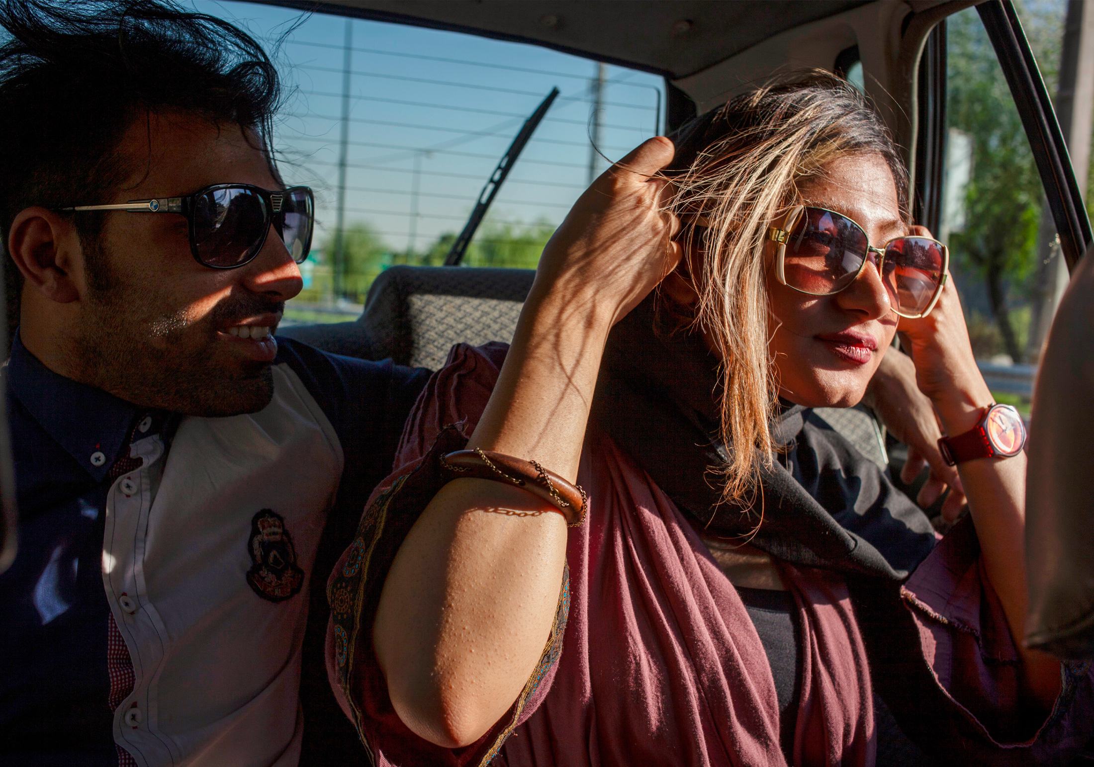 Ali och hans flickvän färdas längs Teherans gator. För många unga är bilen en av få platser där de kan prata fritt och umgås utan att väcka uppmärksamhet. Baksätet upplevs som ett mer skyddat utrymme än gatan. I det offentliga rummet är relationer mellan ogifta fortfarande starkt begränsade. // Foto: Sanna Sjöswärd