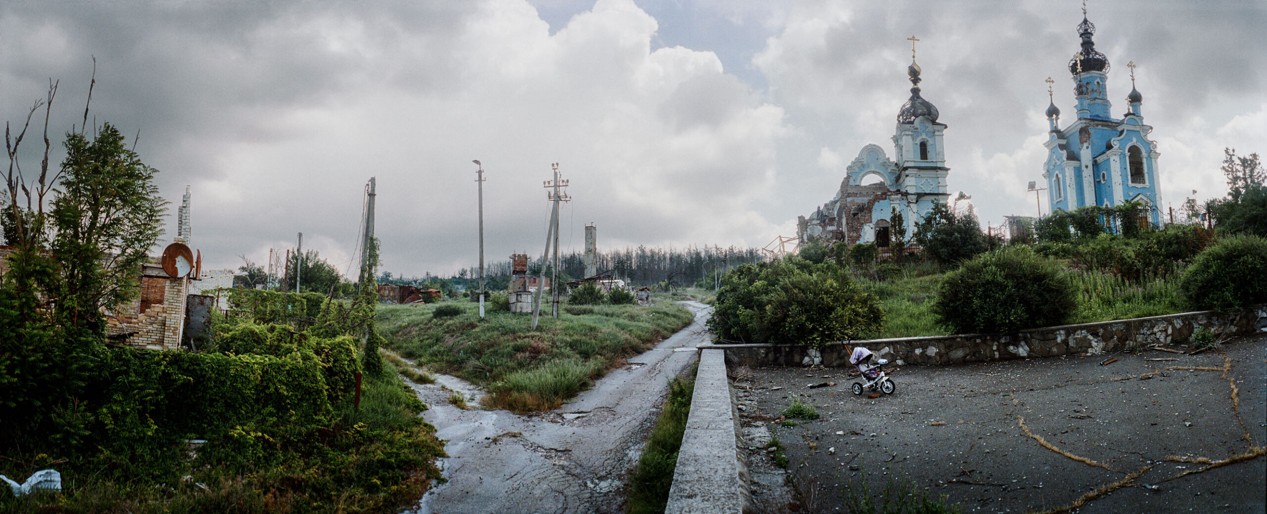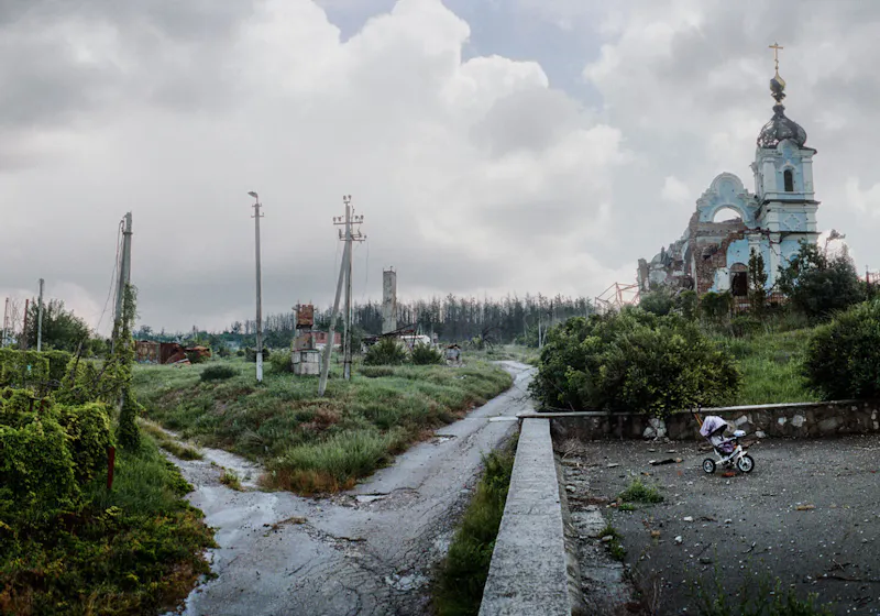 Fast hela dagen, då jag går runt bland de sönderskjutna husen i den mestadels övergivna staden Lyman nära fronten, avbryts tystnaden enbart av gnisslande takplåtar, som rycks med av vinden, samt dova dån från artilleriet.