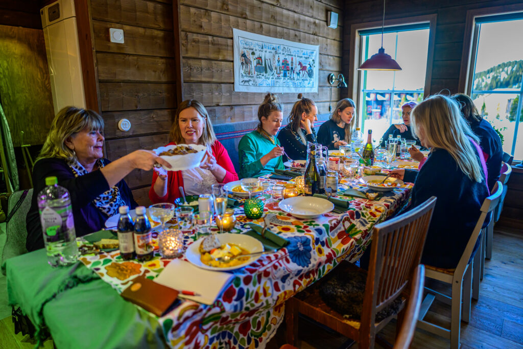 Långbordet är dukat. Servettringar i form av harar och renar. En bård på väggen ovanför. I Jämtland är ”artut” att vara. Fagert om sommarn då öringen hugger och hjortronen locka. Roligt om vintern på skidorna glida i milsvida fjäll.