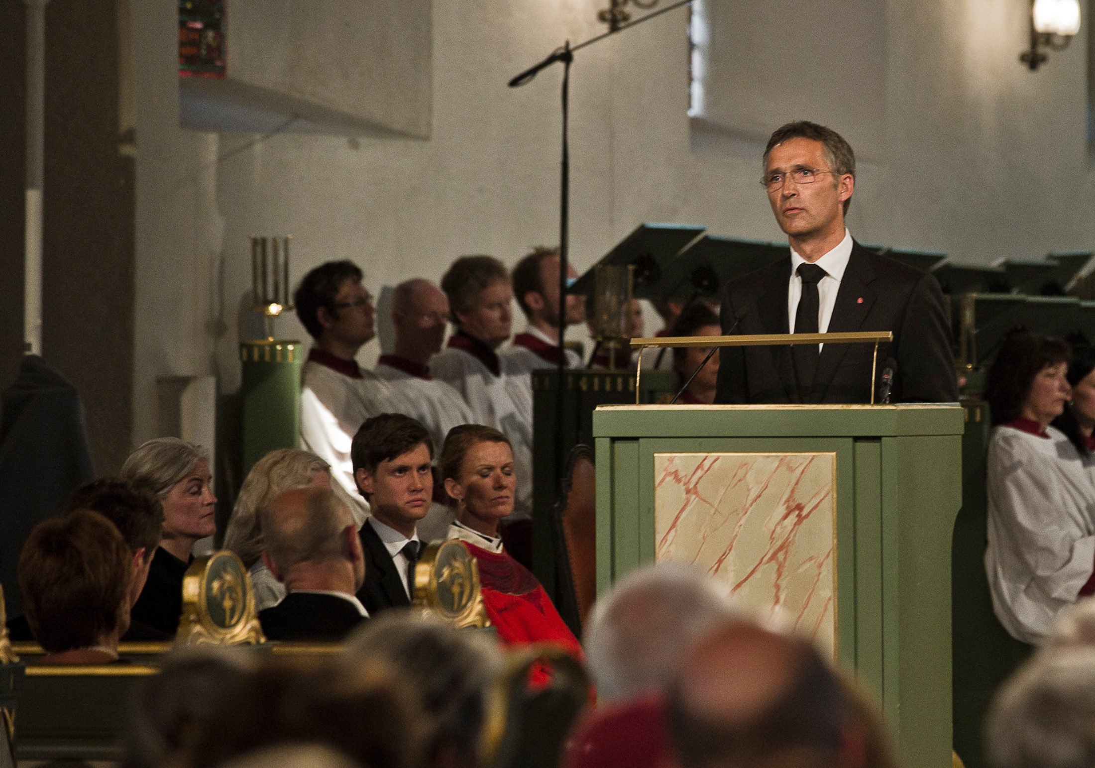 Minnesgudstjänsten hålls för att hedra offren för högerextremisten Anders Bering Breiviks terrordåd den 22 juli. Då lämnade han en vit skåpbil, parkerad utanför regeringsbyggnaden i Oslo. Fem minuter senare exploderar en 950-kilos gödselbomb. Åtta personer dör direkt och ytterligare tio skadas. Efter det tar han sig till ön Utøya i Tyrifjorden, fyra mil från Oslo, som ägs av det norska Arbeiderpartiet. Där pågår ungdomsförbundets årliga sommarläger. Förklädd till polis skjuter Breivik på nära håll ihjäl 69 människor, de flesta under 20 år, och skadar ytterligare 110. Vittnesmålen från ön är fruktansvärda och handlar om besinningslös ondska
