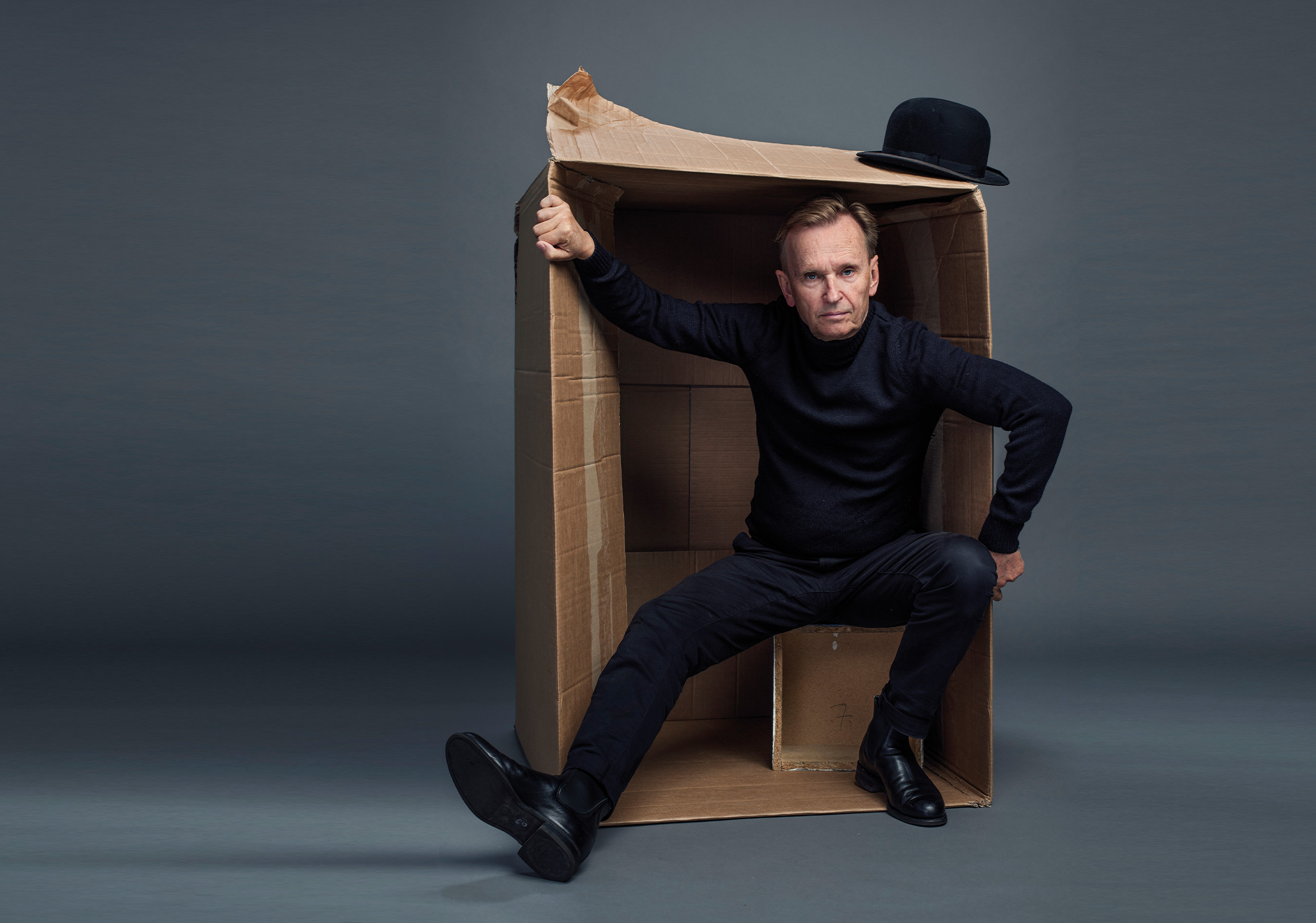 När han kort senare spelar mus med enorma öron vänder han sig plötsligt mot publiken och säger med ett ansikte som är nollställt runt den svarta plastnäsan: