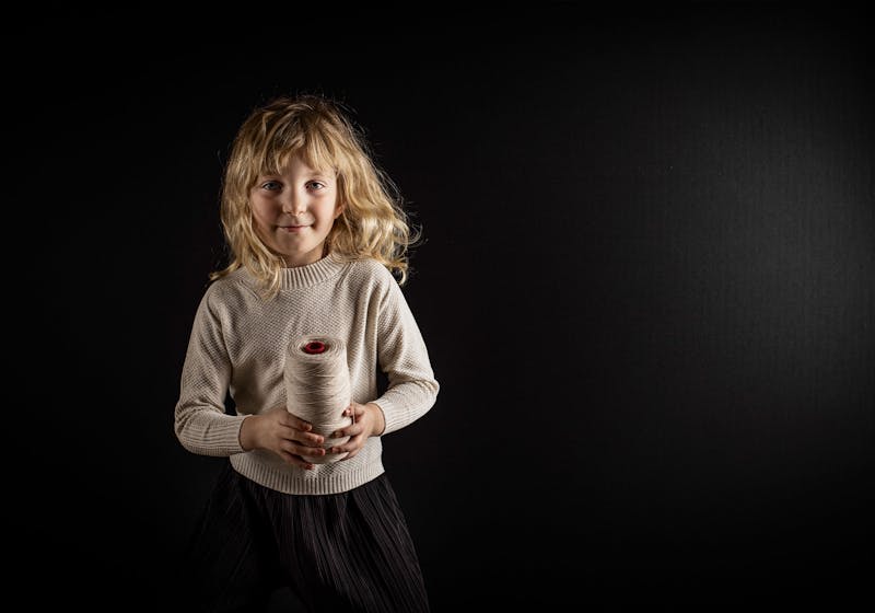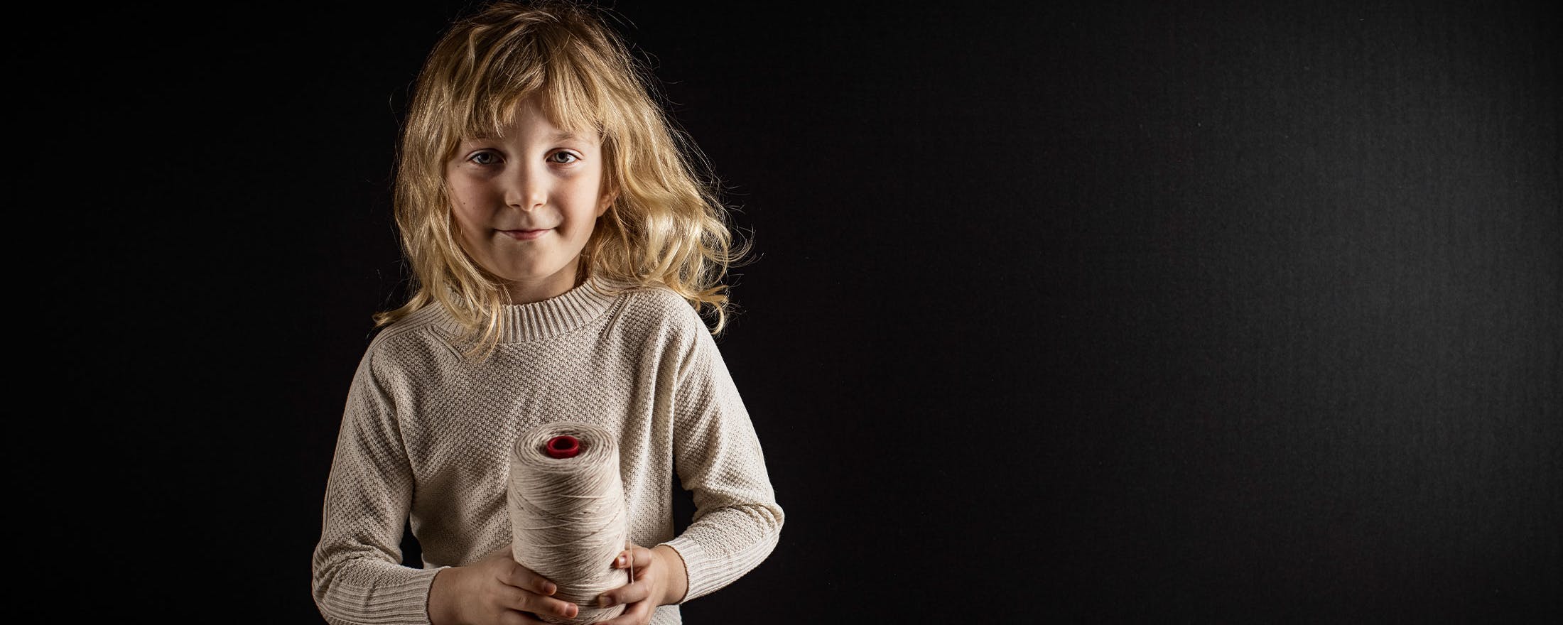 När fluffet, det gamla och det nya, har kardats så spinns tråd som hamnar på rullar och träs in i stickmaskinen.