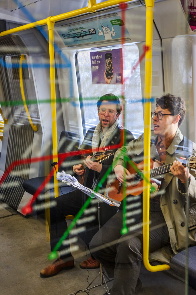 Än så länge är det mest pensionärer och gymnasieungdomar i vagnen. Och de flesta tycks välkomna trubaduren. Den vanligaste reaktionen är en trestegsraket: först luckrar förvåningen upp det sammanbitna, varpå ett leende sprider sig i passagerarnas ansikte. Därefter tar de upp sin telefon för att filma.