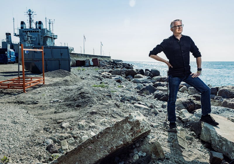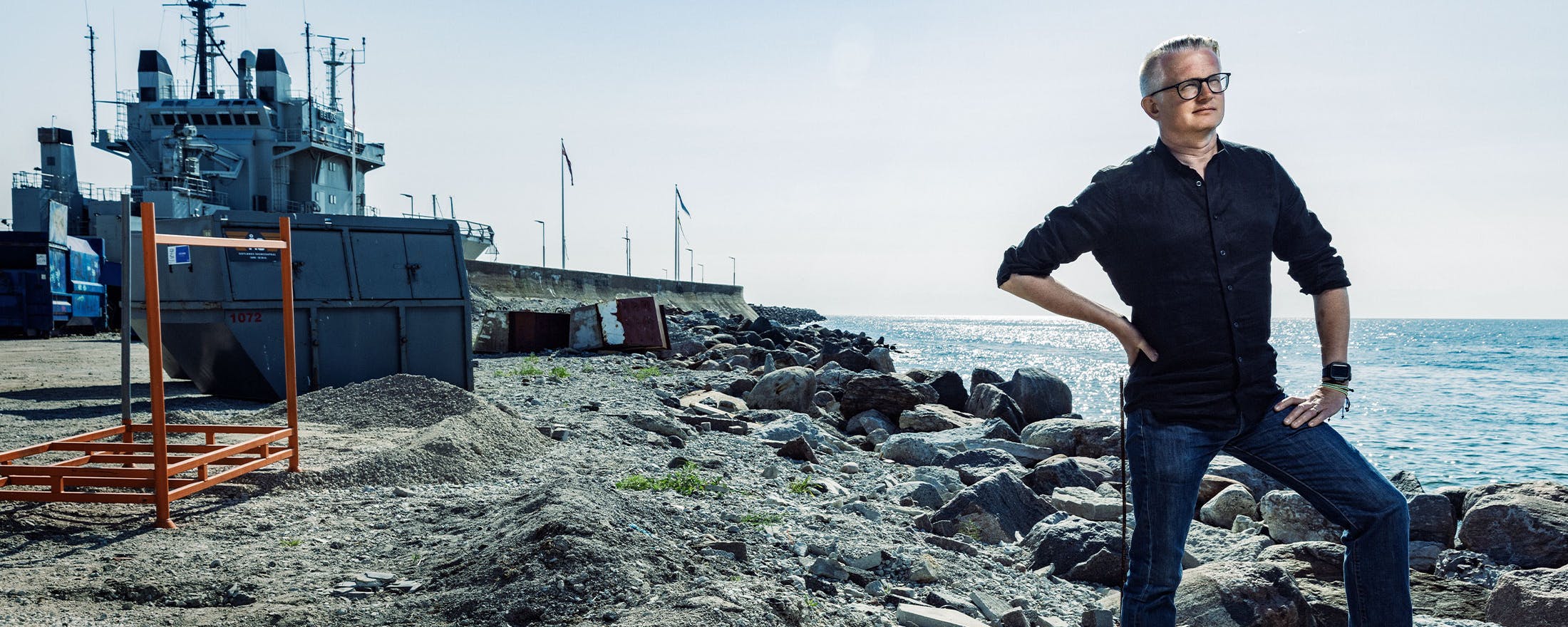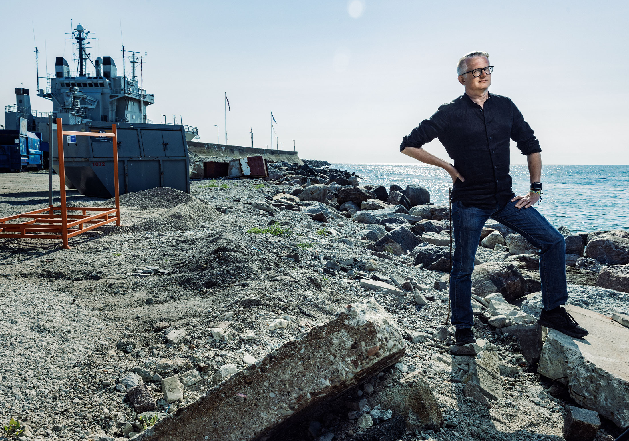 Vid Putinkajen ligger kustbevakningens väldiga grå fartyg Triton förtöjt. Det är en vacker solskensdag, en blå himmel möter ett blått hav i en disig horisont.