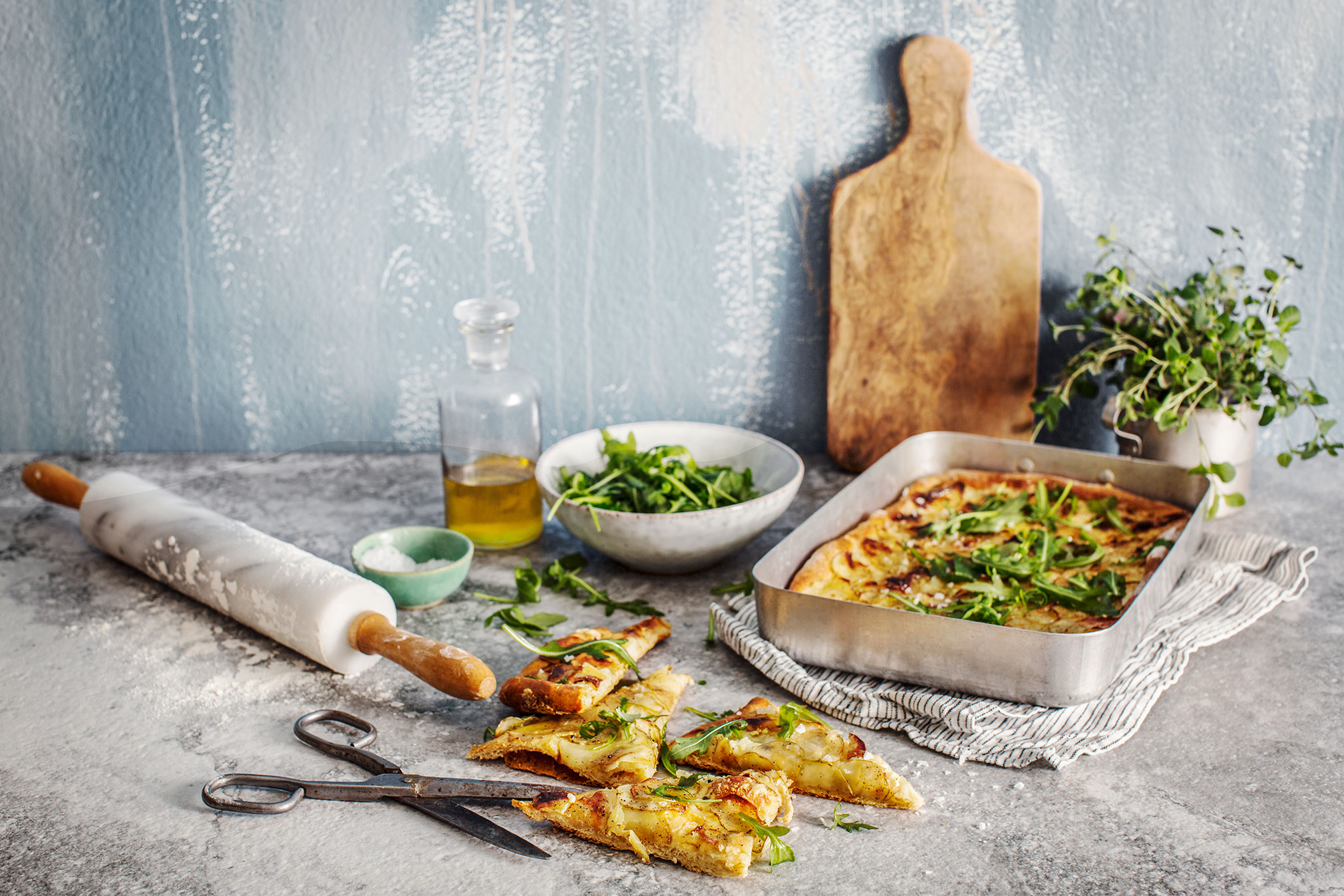 • Lägg potatisskivorna lite omlott över och grädda i cirka 15-20 minuter tills pizzan fått färg och potatisen är mjuk. Ta ut och låt svalna lite. Strö gärna på lite mer flingsalt och peppar. Toppa med ruccola.