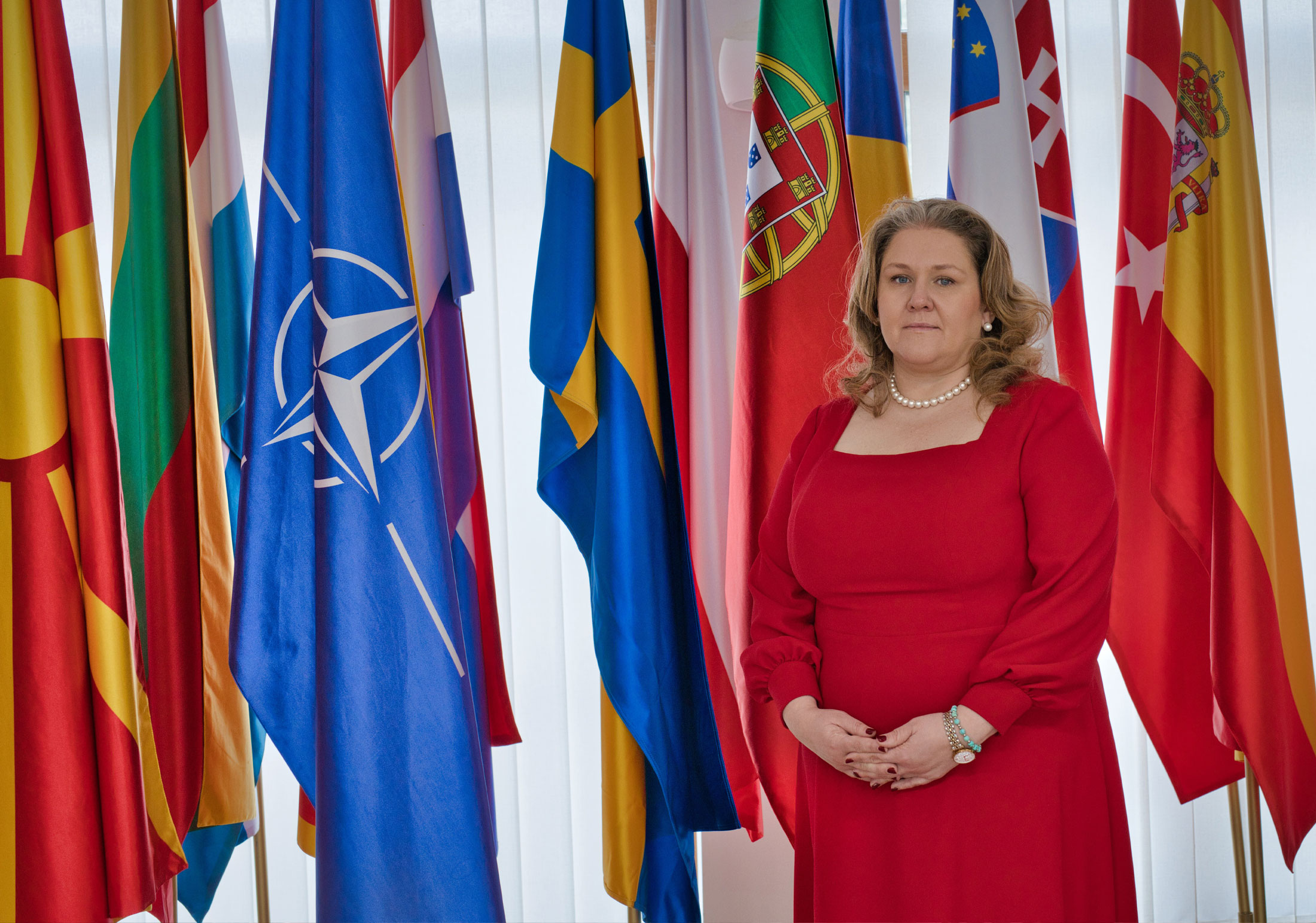 På vägen ut från ministeriet stannar hennes pressekreterare till nedanför trapporna. Hon pekar mot väggen där plakaten med årtalen över Natomedlemmarnas inträde hänger. Längst ner i högra hörnet hänger nu ett nytt plakat: ”Sverige 2024”. Det är färskt från tryckeriet.