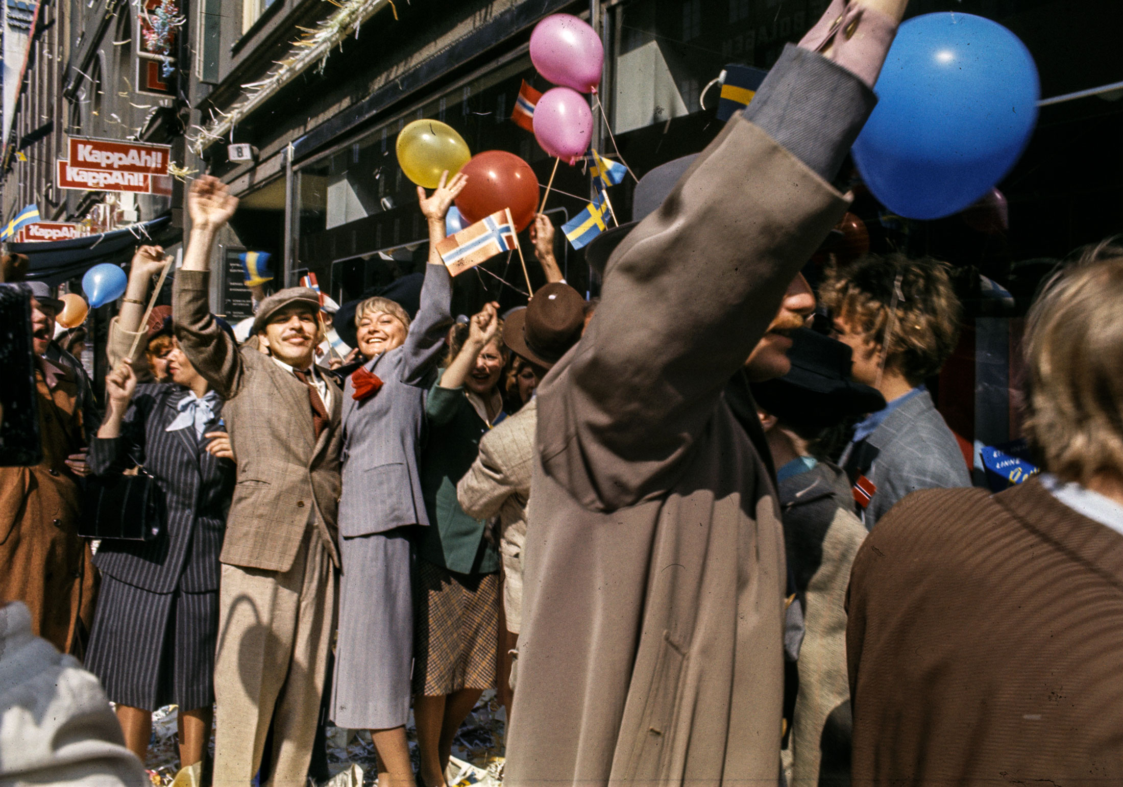 Janne ”Loffe” Carlsson och Monica Zetterlund firar freden som Elof och Sif Olsson i tv-serien ”Någonstans i Sverige”. // Foto: Bo-Aje Mellin / SVT