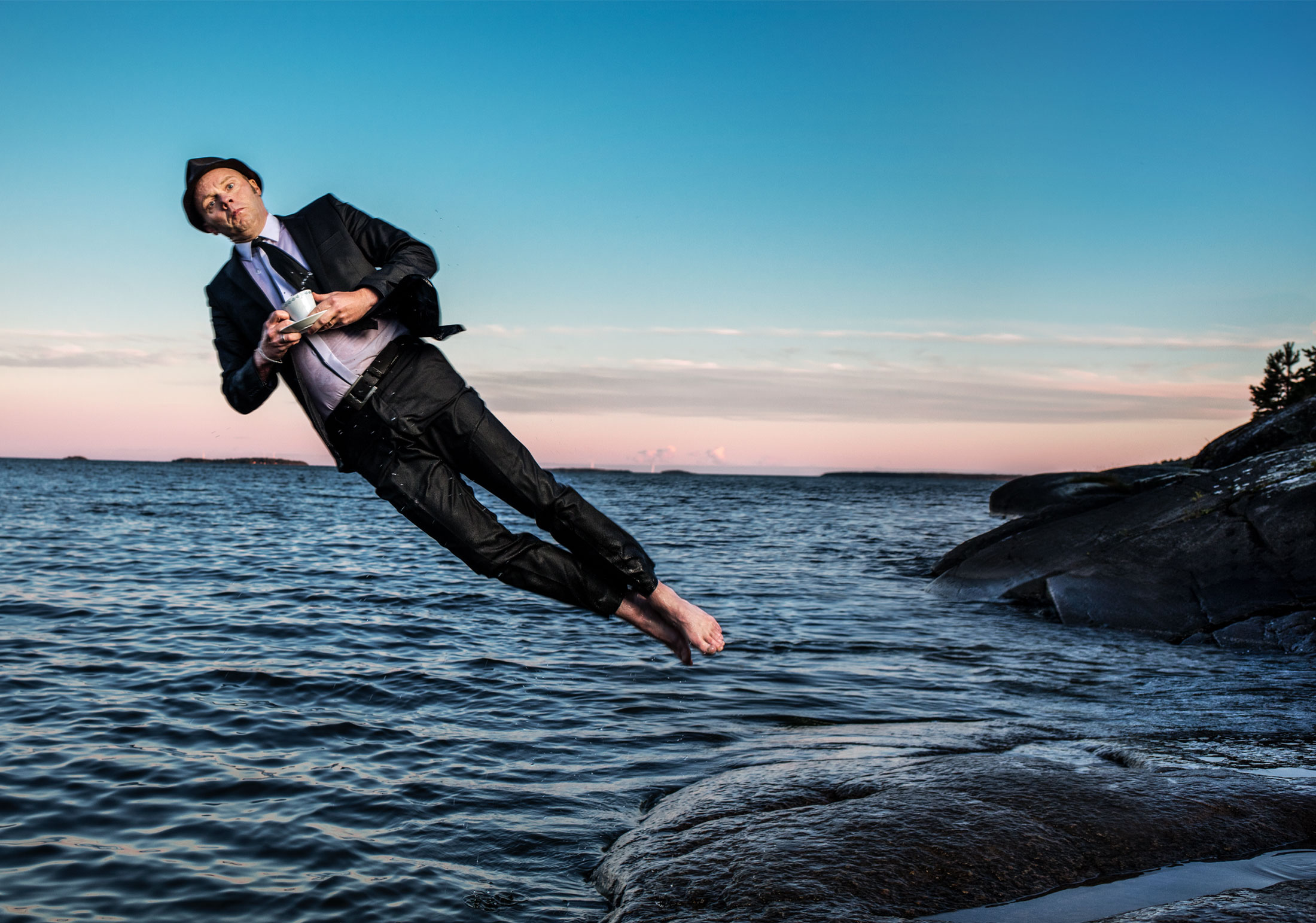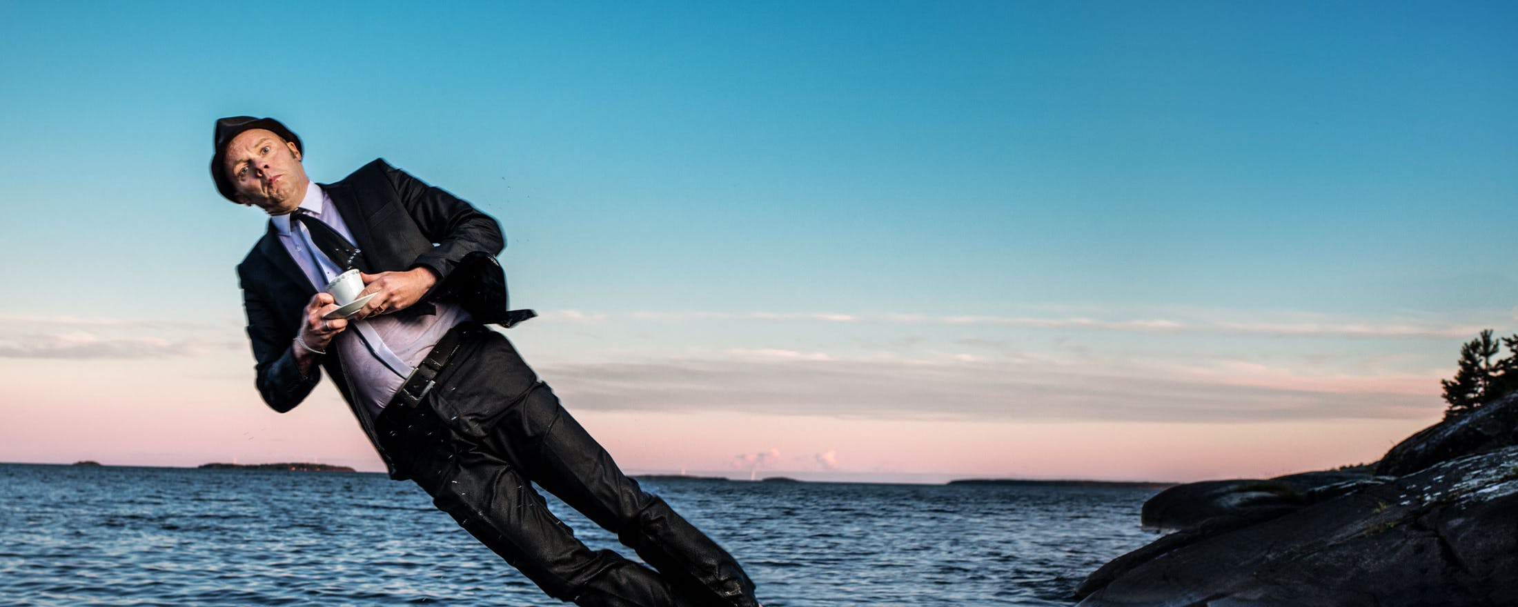 Men så sker det, där vi sitter helt lugnt, till synes avslappnade, några kilometer från solmetropolen Karlstads citykärna: Sveriges möjligen roligaste man bara måste göra det. Upp och röra på sig alltså.