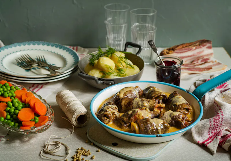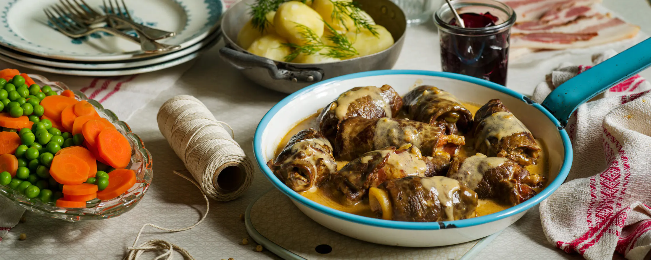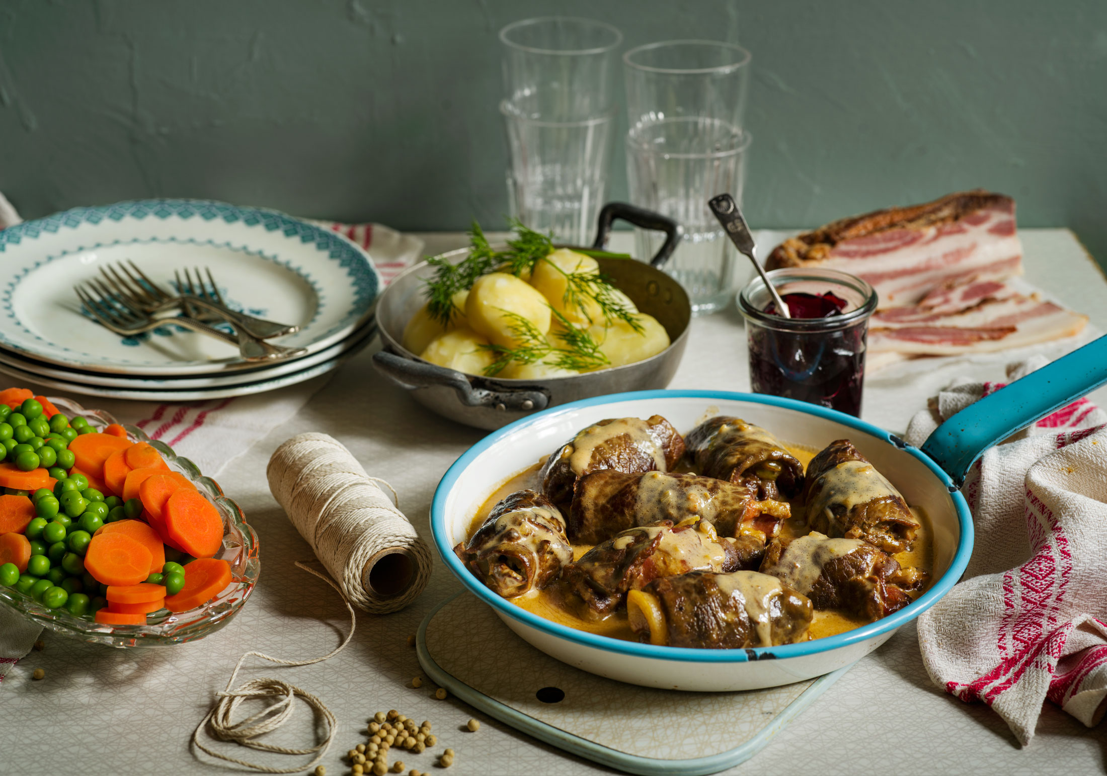 - Lägg rulladerna i såsen och låt allt bli varmt. Servera med kokt potatis, lättkokta grönsaker samt gelé.