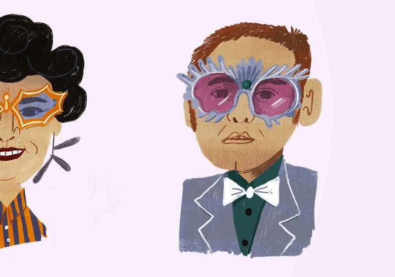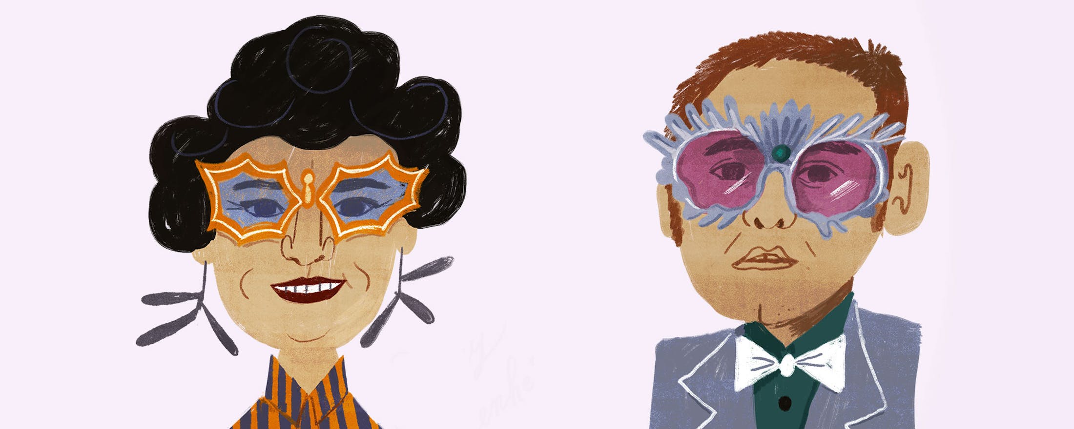 I denna kulturtrupp av bågbärande extravaganter finns till exempel också musikern Elton John, vars långa rad av glasögonkreationer på scen och privat är minst lika omtalad (ja, nästan i varje fall) som hans musik. Här har vi också Phil Manzanera, gitarrist i konstrockargruppen Roxy Music, och hans flugglasögon som han bar under bandets glammigaste period. Eller den amerikanska inredningsarkitekten och modeikonen Iris Apfel som karriären igenom, det vill säga upp i 90-årsåldern, har kunnat ses i sina milt sagt oversized runda bågar. Jättebrillor av en sort som fått henne att märkas också i de mest visuellt bullriga miljöer och som i sin tur har inspirerat den svenska formgivaren Efva Attling i hennes skapande av bågar.