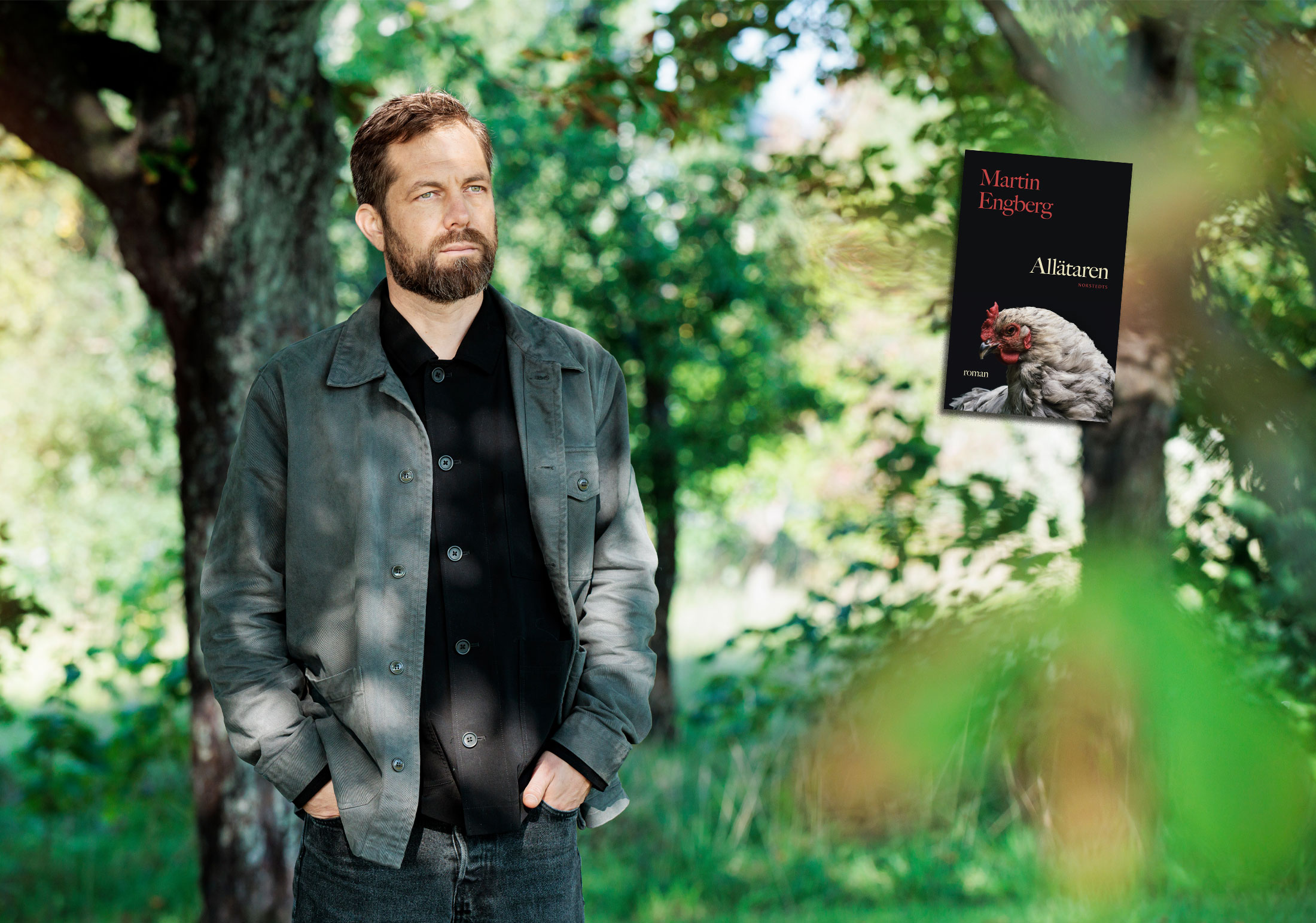 Allätaren är full av uppslag, den spretar lite åt alla möjliga håll, vissa scener är som sketcher som inte riktigt följs upp. Men än sen då? Så är ju också ofta livet. Detta är något av Pettson och Findus för vuxna, korsat med Han Kangs existentiella svärta i Vegetarianen. Till och med hönorna pladdrar där de sprätter och flaxar runt honom. Lite Godot i lingonskogen är det över det hela, med en väldigt stark känsla av att livet är det som pågår medan vi pysslar med annat. Den framväxande veganismen, relationen till brodern och hans barn, liksom till den gamla, egentligen rätt förfärliga, mamman är genomgående. Samt ett metalitterärt spår: Erik beundrar fantasyförfattaren Adrienne Fleur. De gick en gång på samma skrivarkurs, men medan han bara lyckats knåpa ihop novellen GAMMEL GÄDDAN – ja just så, med särskrivning och versaler – håller hon på med den omfattande sviten Skuggkrigarna. Han läser allt hon skriver och skickar anonyma beundrarbrev. Hon bor några gårdar bort och ger ut på eget förlag. När hon håller en skrivarkurs i ”science fiction och fantasy” går han den, skriver en till novell som han blir väldigt nöjd med, men som ingen annan verkar gilla.