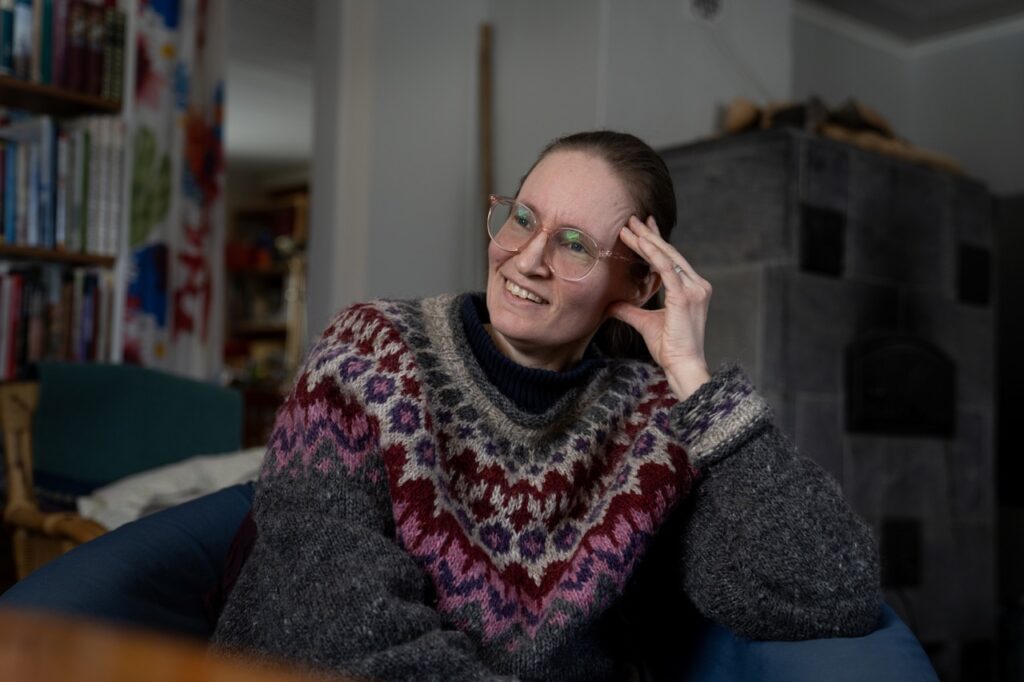 För tio år sedan återvände hon till barndomens plats, i ett hus med egenbyggd elbastu, vävstolar på ovanvåningen och plats för ett tiotal instrument.