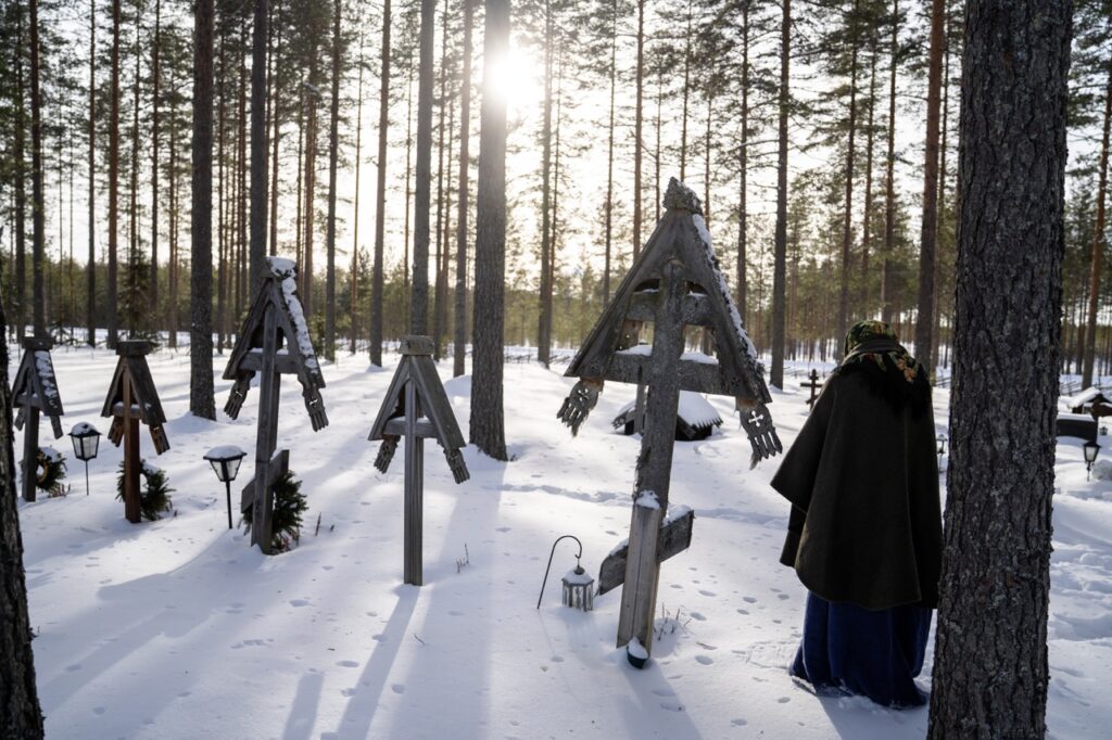 För att förstå lämnar vi folkskolan och reser till en ortodox kyrkogård på gränsen till Ryssland. Under natten har det fryst på, och snön som smält har blivit till is på vägen. Liisa Matveinen är van. Hon kan vägarna som sin handflata.