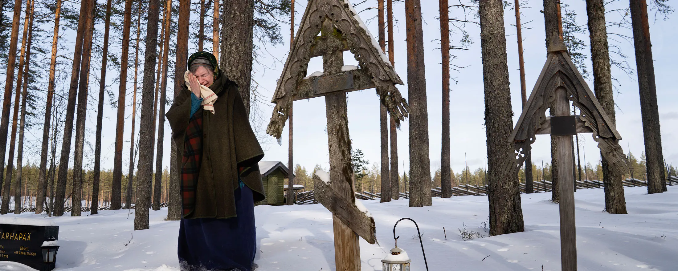 Nu pekar Liisa förbi föräldrarnas gravplatser på naturkyrkogården, ut mot den snötäckta sjön som skymtar mellan tallarna.