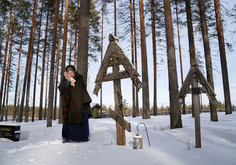 Liisa Matveinen utför en gråtkväd vid sina föräldrars gravar på hembyns gravplats. // Foto: Malin Palm