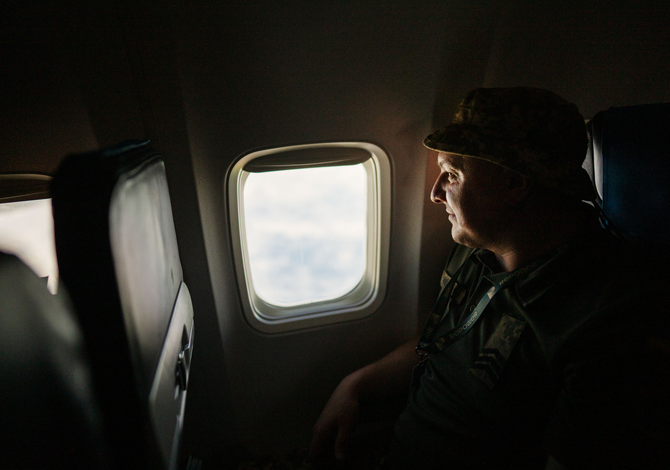 Roman sitter på ett flygplan till Sverige med nästan hundra andra militärsjukvårdare och läkare. // Foto: Meli Petersson Ellafi.