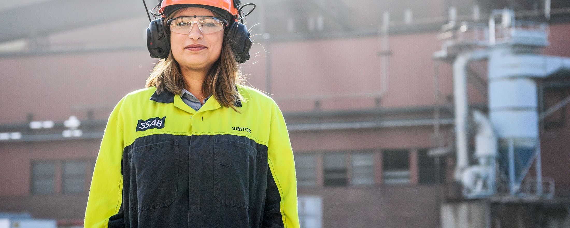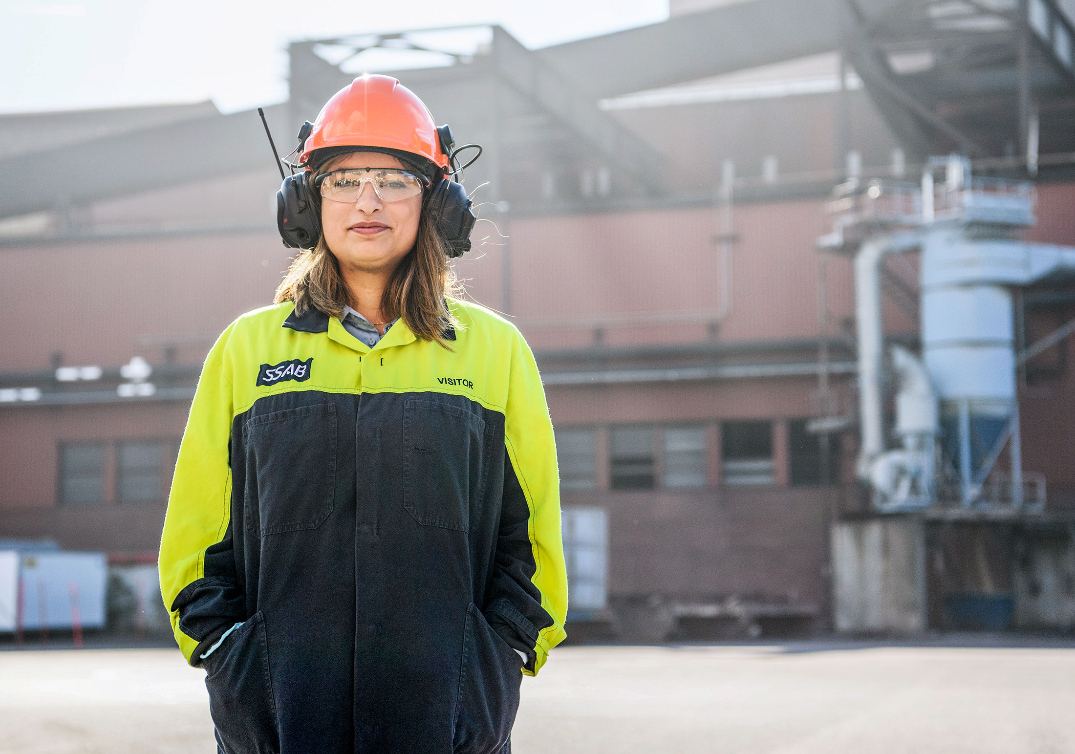 Nooshi Dadgostar vill närma sig arbetarna på industriorterna, utan att förlora storstadsväljarna. Här besöker hon SSAB i Oxelösund. // Foto: Henrik Montgomery/TT